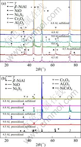 Fig. 2 XRD patterns of as-cast (a) and pre-oxidized (b) Ni–16Cr–xAl alloys before and after hot corrosion for 100 h at 600 ℃