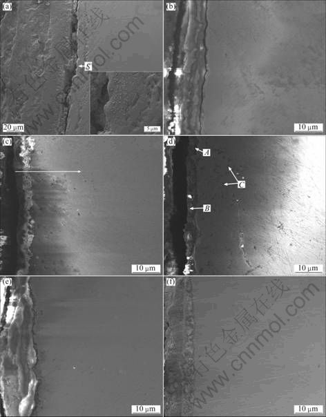 When immersed in the mixed salts, the as-cast samples were oxidized firstly by the dissolved oxygen [9]. Alumina and chrome were formed according to the selective oxidation, and the mixed salts would easily react with the oxides. Under this condition, the oxides could hardly form continuous protective oxide layer and thus serious hot corrosion occurred. According to the reaction 2SO42-=2O2-+3O2+2S [10-11], it was known that the continuous formation of the oxides on the surface of the alloy lowered the p(O)2 in the salts and increased the sulphur potential, leading to the transport through the oxide scale and the formation of sulfide at the interface of scale and metal. As seen from Fig. 5 and Fig. 6, sulfides are detected at the interface of scale and metal. It was suggested that NiSO4 was formed by outward diffusion of Ni through the sulfide, and the reaction [12] 9Ni+2NiSO4=8NiO+Ni3S2 subsequentially took place, which can explain the production of NiO and Ni3S2 (Fig. 2(a)).