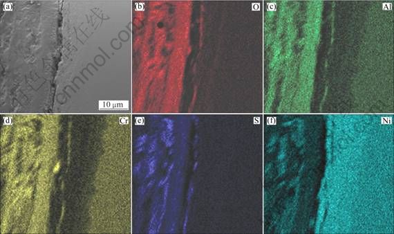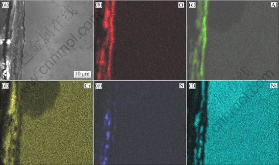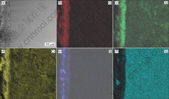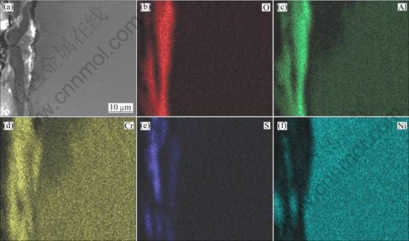 Figures 4(e) and (f) show the morphologies of the pre-oxidized Ni–16Cr–6.8Al and Ni–16Cr–9.0Al alloys after hot corrosion at 600 ℃ for 100 h, respectively. A corroded layer with a thickness of about 10 μm is observed, but the corrosion affected zone can be hardly found. The corresponding element distribution maps of the cross-sections are presented in Fig. 8 and Fig. 9, respectively. It may be noted from Fig. 8 that the corroded scale formed on the pre-oxidized Ni–16Cr–6.8Al alloy is mainly rich in Cr, Al, O and S, with a small amount of Ni. Combined with the chemical composition analysis of the pre-oxidized samples, the Al2O3 scale, which was formed during pre-oxidation, effectively retards the inward diffusion of sulfur to alloy/scale interface. Therefore, the sulfide was mainly distributed in the outer oxidized scale rather than substrate. The chemical composition of the corroded scale for the pre-oxidized Ni–16Cr–9.0Al alloy, as seen from Fig. 9, is similar to that of the pre-oxidized Ni–16Cr–6.8Al alloy. However, the scale formed on the pre-oxidized Ni–16Cr–9.0Al alloy is more compact, continuous and uniform in comparison with that of the pre-oxidized Ni–16Cr–6.8Al alloy.