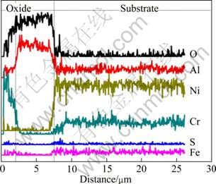 It can be seen from Fig. 4(c) that after hot corrosion for 100 h, a thinner corroded scale with a thickness of 6 μm and deeper corrosion affected zone of about 18 μm beneath the scale are observed on the cross-section of as-cast Ni–16Cr–9.0Al alloy. Figure 7 shows the line distribution of different elements along the arrow marked in Fig. 4(c). It is clearly found that two layers constitute the corroded scale, including an outer Cr2O3 layer and inner Al2O3 layer. A trace amount of sulfur is determined in the corrosion affected zone, which implies that the internal sulfidation occurs in the region.
