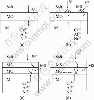 Fig. 10 Schematic diagram showing growth of sulfide layer on pre-oxidized Ni–16Cr–xAl alloys during hot corrosion in Na2SO4–25% NaCl at 600 ℃: (a) Diffusion of S2-, Al3+, Cr3+ and Ni2+ in oxide layer; (b) Nucleation of sulfides at oxide/salt interface; (c) Formation of sulfides in oxide layer; (d) Growth of sulfides near oxide/alloy interface