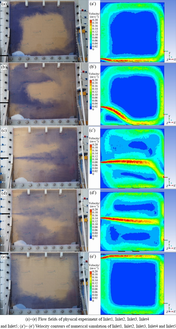 在隔膜电解提锂过程中,槽内电解液的运动主要依赖于进口流体的惯性力。进水口的位置决定了位置水头的大小,同时,当进水口的位置靠近壁面时,流体流速会较快的减小,进而影响入流对槽内静止流体的搅动效果。本文将不同进水口位置对流场影响的物理实验与对应的数值模拟实验进行对比,以验证所采用数学模型的准确性。不同的进水口位置对电解槽内流体的影响如图3所示,图3(a)~(e)分别对应于图1(b)中的Inlet1、Inlet2、Inlet3、Inlet4、Inlet5。