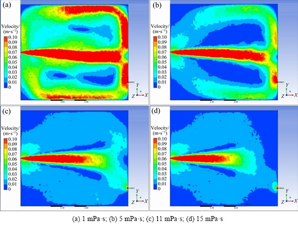 当流体在外力作用下,流体微元间出现相对运动时,流体的黏性将会阻碍流体内部的相对滑动,从而阻碍流体的流动。而盐湖卤水中含有大量的盐,其黏度较大,对槽内电解液的流动影响较大。周喜诚[22]测得新疆罗布泊盐湖卤水的老卤的黏度为11 mPa·s,密度为1.43 g/cm3,以此数据为数值模拟参数的参考值,清水黏度1 mPa·s作为一个数据,另外在黏度11 mPa·s上下各选一个数据,分别选为5 mPa·s和15 mPa·s。同时,流体的流量设定为210 L/h,选择c进水口(Inter3),同样采用标准k-ε湍流模型对槽内电解液的流场进行数值模拟。不同黏度的速度等值线图如图5所示,图5(a)~(d)对应的黏度分别为1、5、11和15 mPa·s,同时为了更好的进行对比,将图中的速度区间设置为0~0.1 m/s。