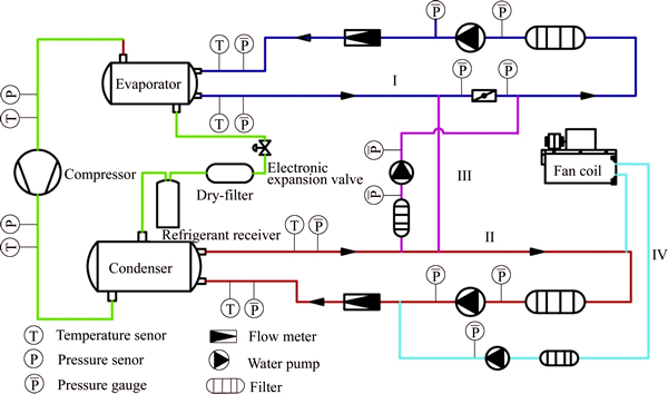 The refrigerant loop mainly includes an evaporator, a condenser, an electronic expansion valve and two scroll compressors with lubricating oil of 320SZ. The water loop includes a heating- water system I, a cooling-water system II, a water- mixer system III and an auxiliary cooling-water system IV. Heat is transferred from the cooling- water system to the heating-water system by the water-mixer system. However, the heating-water system cannot absorb the gross heat from the cooling-water system. Therefore, an auxiliary cooling-water system with a fan coil unit is used to discharge excess heat from the cooling-water system to the environment, ensuring that the water loop operates stably [23]. Table 1 lists the apparatus parameters of the HTHP system.