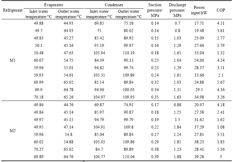 The experimental performances of the HTHP system using M1 and M2 as refrigerants were tested respectively. The inlet and outlet temperatures of the condenser and evaporator were set. Experimental data were recorded when the HTHP system reached its steady state, where the temperature fluctuations were smaller than ±0.3 °C and water flow rate of the heating water system and cooling water system fluctuated within a range of ±5%.