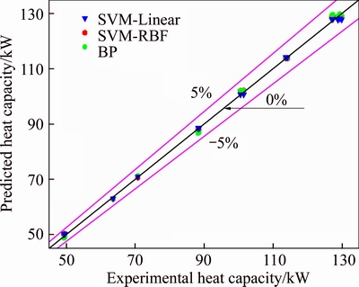 Figure 3 Performance of SVR-Linear, SVR-RBF and BP models for heat capacity prediction