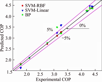 Figure 5 Performance of SVR-Linear, SVR-RBF and BP models for COP prediction