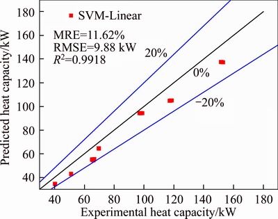 Figure 6 shows a plot of the predicted values versus experimental data for the heat capacity. The error level of the model is below ±20 % in the case. The SVR-Linear model in the heat capacity prediction products a MRE of 11.62, RMSE of 9.88 kW and R2 of 0.9918. Figure 7 presents a plot of the predicted values versus experimental data for the power input. The power input prediction using the presented SVR-Linear model yields a MRE of 0.38, RMSE of 0.15 kW and R2 of 0.9991 with the experimental data. Figure 8 gives a plot of the predicted values versus experimental data for the COP. As shown in Figure 8, the SVR-RBF model in the COP prediction obtains a MRE of 6.26, RMSE of 0.21 and R2 of 0.9856. The error level of the model is below ±20 % (ranging from –0.22% to 16.19%) in the case.