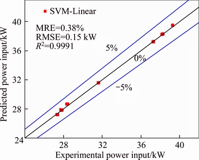 Figure 7 Comparison of experimental and predicted power input using SVR-Linear model