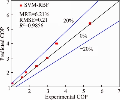 Figure 8 Comparison of experimental and predicted COP using SVR-RBF model