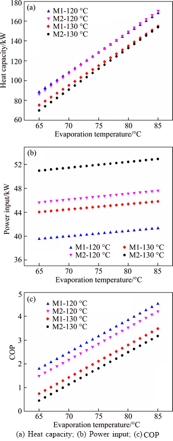 As seen in Figure 9(a), higher evaporation temperature achieves higher heat capacity and higher condensation temperature results in a lower heat capacity which is no surprise. The suction density and the mass flow rate of working fluid increase with the condensation and evaporation temperature, which leads the increase of the heating capacity. The heat capacity of M1 is lower than that of M2 at a low condensation temperature due to the high latent heat of M2, but the heat capacity of M1 is slightly higher than that of M2 when the condensation temperature exceeds 120 °C. Some of this is due to the fact that the latent heat difference between M1 and M2 decreases with the increase of the condensation temperature.