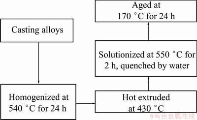 The nominal compositions of the alloys used in this study were listed in Table 1. Si, Sc and V were introduced by means of Al-23Si, Al-2Sc and Al-4V (mass fraction, %) master alloys, respectively, Cr and Zr were put into the alloy in the form of chromium tablet and zirconium tablet (contain 63% Cr and 85% Zr respectively including burning loss). Other elements were introduced by relevant commercial pure metals. The contents of (Zr+Sc) added in each alloy are almost the same (about 0.15%-0.16%) to eliminate the effect of different amounts of (Zr+Sc) on the microstructures and mechanical properties of the new Al-Mg-Si-Cu alloy. The alloy was melted in a graphite crucible inside a medium frequency induction furnace. Ingots with diameter of 60 mm were prepared with water-cooling copper mold at 750 °C after the melt was degassed, slag removed and refined. Then they were machined into ingots with dimensions of d46 mm×90 mm after homogenization for hot extrusion. At last, the bars with diameter of 12 mm were produced at 430 °C by means of backward extrusion. The heat treatment and hot extrusion process were illustrated in Fig. 1. The mechanical tests for as-extruded alloys and aged alloys were conducted at room temperature. At least three tensile samples for each case were tested by CMT5105 universal test machine to obtain the mechanical properties at a constant ram velocity of 2 mm/min. The microstructures were observed by optical microscope, scanning electron microscope (SEM), transmission electron microscope (TEM) with energy dispersive X-ray spectrometer (EDS).