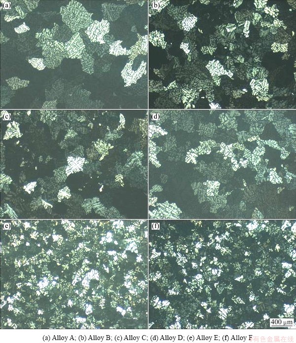 Figure 2 shows the as-cast microstructures of the Al-Mg-Si-Cu-Cr-V alloys with different additions of Zr and Sc elements. Figure 2(a) indicates that the as-cast microstructure of the base alloy is characterized by coarse dendritic grains. Figure 2(b) illustrates that the as-cast grains are refined to some extent when the alloy is added only 0.15% Zr. Both the as-cast grain sizes of alloys C and D are similar to that of alloy B, as shown in Figs. 2(c) and (d). Figure 2(e) shows that a further reduction in the as-cast grain size is carried out in alloy E. While the finest as-cast grains are present in the microstructure of the alloy with only 0.15% Sc addition as shown in Fig. 2(f), almost all of them become into equiaxed grains. It means that both Zr and Sc have the ability to refine the as-cast grains, and the effect of Sc on the as-cast grain refinement is much larger than that of Zr. The as-cast grain size of the alloy decreases with the increase of Sc content. The joint addition of Zr and Sc leads to the formation of Al3(Zr, Sc) particles. When the ratio of Zr to Sc is 4:1 or 2:1, the slight difference of Zr content and the small amounts of Al3(Zr, Sc) particles result in the slight grain refinement of the as-cast alloy, compared with alloy B. But when the Sc content reaches up to 0.1%, the Al3Sc particles lead to an obvious as-cast grain refinement. So the impact of these particles on the as-cast grain refinement of the alloy is Al3Sc>Al3(Zr, Sc)>Al3Zr. The reason is that there is a good coherent interface between the fine Al3Sc particles and α(Al) during solidification, so these Al3Sc particles promote the non-homogeneous nucleation and as a result, the grains are refined [12]. The Al3(Zr,Sc) particle has a lower coherency level than the Al3Sc particle, and Al3Zr particle has the lowest coherency level among them.