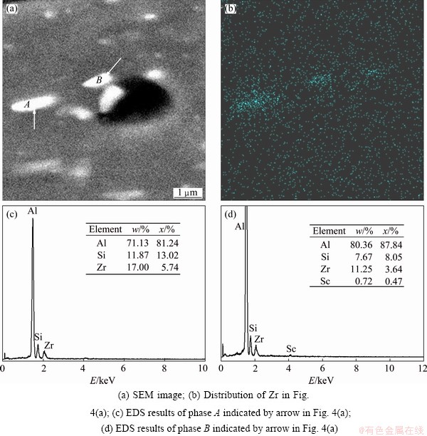 Figure 4 shows the SEM image of the as-extruded alloy C in the longitudinal direction. The distribution of Zr in the as-extruded microstructure shown in Fig. 4(a) is illustrated in Fig. 4(b). It is obvious that some Zr containing phases with elliptical shape exist in the alloy. The EDS analysis results are shown in Figs. 4(c) and (d). Figure 4(c) indicates that Zr exists in the as-extruded alloy in the form of Al3Zr particles with elliptical morphology, and Fig. 4(d) shows that some Zr atoms are substituted by Sc atoms to form elliptical Al3(Zr,Sc) phases.