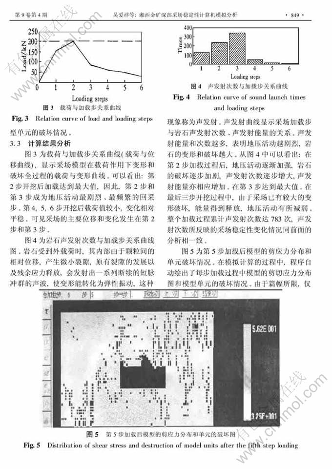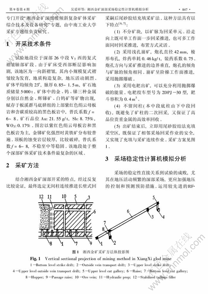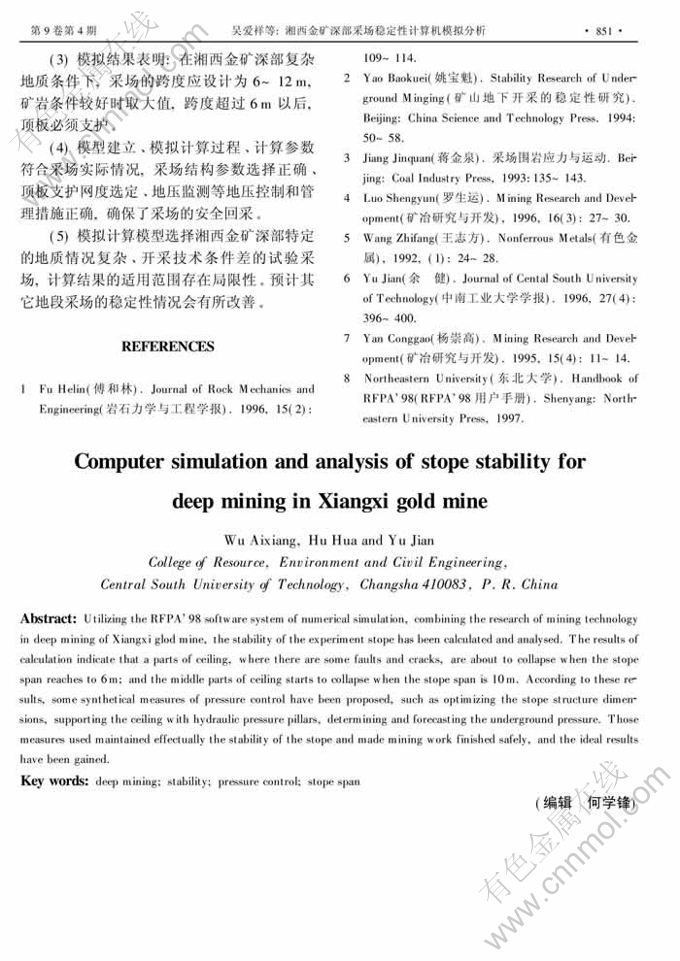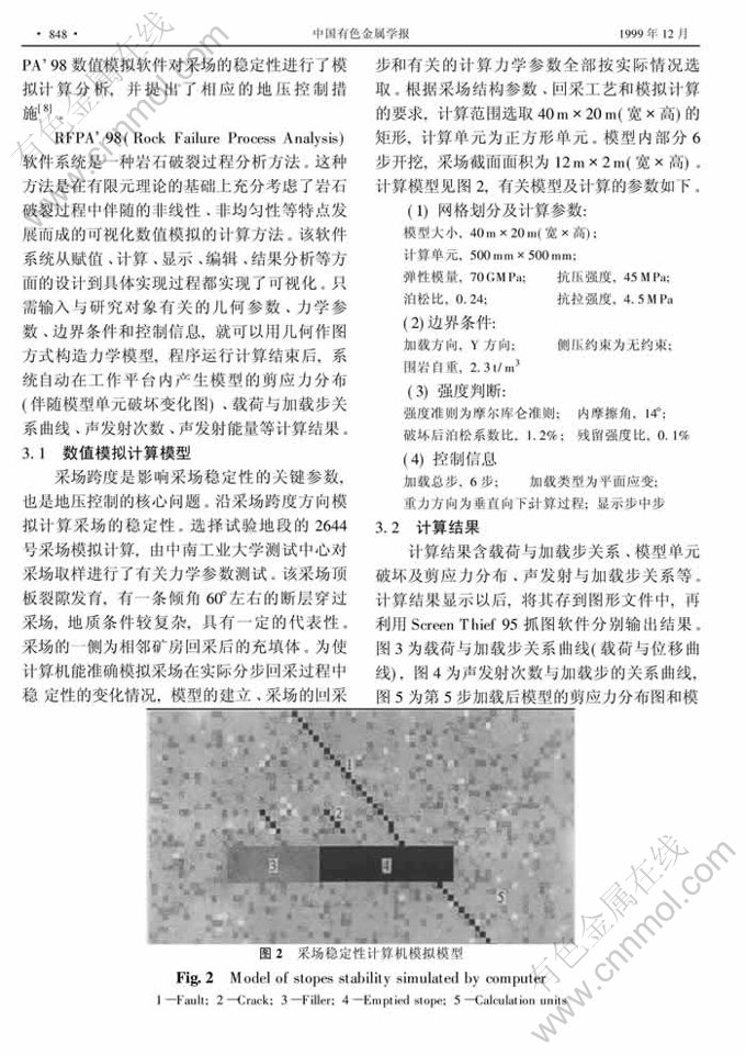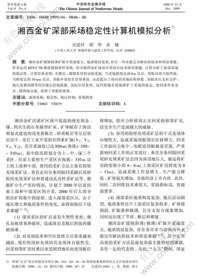 摘 要:湘西金矿缓倾斜薄矿脉开采深度大,地质情况复杂,存在一些未能完全解决的技术和理论难题。作者运用RFPA'98 数值模拟软件系统,结合湘西金矿深部开采综合技术研究课题,计算分析了深部采场的稳定性。计算结果表明:在断层、裂隙发育的试验采场,当采场跨度达到6 m以后,顶板局部开始垮落;当跨度达到10 mm以后,顶板中部发生冒顶事故。由此提出了相应的采场结构参数、顶板水压支柱支护、地压监测预报等综合地压控制措施。实际应用表明,这些措施有效地维护了采场的稳定,使回采作业安全、顺利地完成,获得了理想的效果。