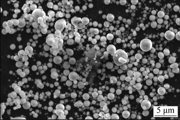 图3所示为表面镀镍石墨烯铝材料粉体扫描电镜照片。从图3可以看出,与铝粉混合之后的石墨烯还保留着二维片状结构,片层厚度和混合之前的石墨烯(见图1)相比有所减薄。推测石墨烯的减薄是由于石墨烯在无水乙醇中超声震荡,在外力的作用下,片层之间的范德华力遭到破坏,石墨烯层数减小;在随后的机械搅拌过程中,铝颗粒对石墨烯产生撞击、剪切等作用,再次破坏了石墨烯片层之间的范德华力,使石墨烯片较为均匀地分散在铝粉中,但是目前还没有直接证据证明该分析结果。同时,实验中所用的石墨烯进行了表面镀镍处理,改善了石墨烯和铝粉的相容性,并且提高了石墨烯的密度,使石墨烯和铝粉密度差减小,利于石墨烯在铝粉当中的均匀分散。