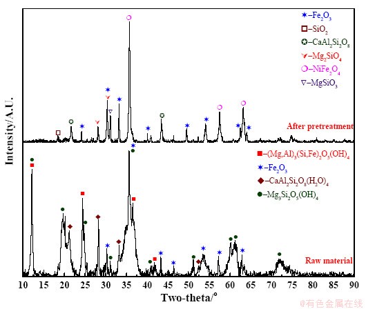 由于红土镍矿中有大量的结晶水,烧损高达17.35%。因此,在热重-质谱实验之前,先将红土镍矿置于焙烧炉中进行预处理(1000℃焙烧2h),以去除原料中的结晶水。红土镍矿预处理前后的XRD图谱如图1所示。结果表明,原矿中铁主要以赤铁矿(Fe2O3)的形式存在,脉石矿物包括斜方沸石[CaAl2Si2O8(H2O)4]、叶蛇纹石[Mg3Si2O5(OH4)]、利蛇纹石[(Mg,Al)3(Si,Fe)2O5(OH)4]。预处理后红土镍矿中的结晶水及羟基均已除去,同时蛇纹石相分解为橄榄石(Mg2SiO4)和顽火辉石(MgSiO3),另外,镍铁氧化物发生反应生成NiFe2O4。