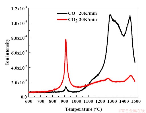 对经过预处理的红土矿石进行研磨,确保样品粒度100%小于0.074mm;以石墨粉作为还原剂,将C/O元素摩尔比固定为1.2进行配料并充分混匀,然后向样品添加4.47wt.% Na2CO3,C/O摩尔比中的O含量表示铁、镍氧化物中的总的氧元素含量。热重(TG)实验采用SetaramEvo TG-DTA1750分析仪进行,将约20mg的样品装入氧化铝坩埚内(Φ6mm×8mm),放置在热重装置的样品台上。设定好加热速率后,在保护气氛为Ar的条件下进行热重实验,气体流速为20mL·min-1。加热速率分别为10K/min、15K/min和20K/min。利用质谱仪(TILON LC D200,AMETEK LLC)原位检测热重实验产生的尾气,气体分析表明,CO2和CO是还原过程中的两种主要气体。