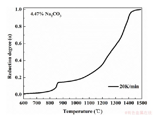 (1)添加Na2CO3后,红土镍矿碳热还原开始温度相比无添加剂时提前了350oC左右,与添加Na2SO4时相比提前了250oC左右;碳的气化反应开始温度相比无添加剂及添加Na2SO4时分别提前100oC与200oC。