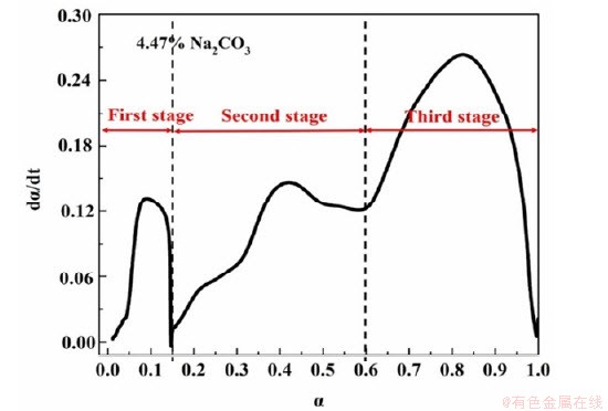 由于三个不同升温速率下的转化率—温度曲线变化趋势接近,因此本实验采用升温速率为20K/min的还原失重数据,探究Na2CO3对红土镍矿还原过程动力学的影响。动力学分析时,首先计算了添加Na2CO3时红土镍矿还原转化率与温度的关系,如图4所示;将转化率对时间进行求导,还原速率与转化率的关系如图5所示。从图中可以看出,红土镍矿碳热还原转化率随温度波动较大,总体呈加速的趋势。通过反应速率的曲线图,可将红土镍矿添加Na2CO3后的碳热还原过程分为三个阶段,分别为:α=0~0.15、α=0.15~0.60、α=0.60~1.0。