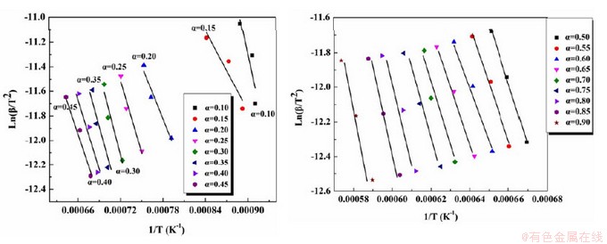 由公式5可知,在加热速率相同的情况下,ln(β/T2)与1/T成正比。因此,通过计算斜率获得活化能,并在确定模型函数后得到前指数因子A。在失重曲线上截取不同升温速率β下相同转化率α时温度T的值,由ln(β/T2)对1/T作散点图,通过最小二乘法对ln(β/T2)和1/T线性回归,根据线性回归直线斜率计算转化率为α时反应的活化能,图6所示为活化能计算结果。