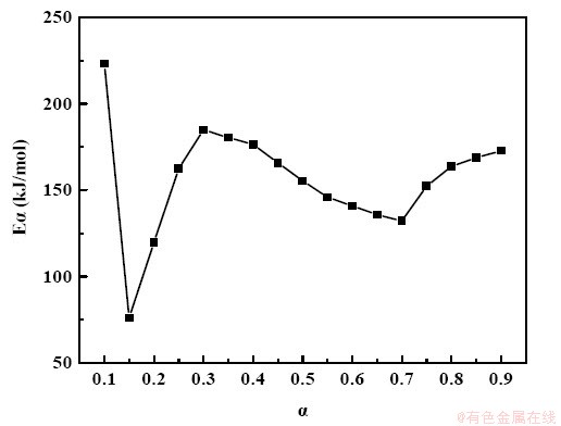 图7 红土镍矿碳热还原过程的活化能与转化率的关系
