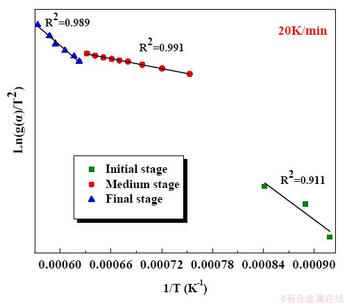(2)用Coats-Redfern法确定了不同阶段的机理函数,对于初始阶段(α=0~0.15),反应机制为二维扩散,积分形式为