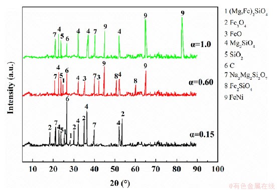 碳热还原反应结束,即α=1.0时,金属镍铁(FeNi)的衍射峰加强,这表明有更多的金属镍铁生成。另外,Fe2SiO4和FeO衍射峰在这一阶段消失,这表明Fe2SiO4和FeO被还原,并且由于加入的过量石墨粉,因此当红土镍矿碳热还原反应结束后仍然有碳剩余。此时的矿物组成为:FeNi、SiO2、Mg2SiO4、Na2Mg2Si2O7。因此,碳热还原反应第三阶段发生的主要化学反应如下所示: