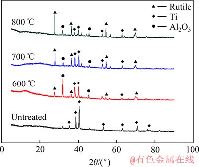 Fig. 2 XRD patterns of untreated and thermally oxidized titanium alloy samples at different temperatures