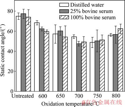 生物活性关系到钛合金假体材料在体内环境下的生物相容性,体内评估方式较困难,一般采用体外评估方法,如与组织器官的生物学反应,细胞粘附、增殖、分化、存活率,有毒金属离子的释放以及润湿性等。OLMEDO等[34]将金红石型和锐钛矿TiO2粉末注入雄性Wistar大鼠后,通过分析血清、血细胞、肝、脾、肺内的生物学反应比较两种成分的生物活性,发现金红石型相对锐钛矿TiO2能降低对机体的损伤,具有更高的生物活性。SALDANA等[35-37]比较了Ti6Al4V试样在500和700 ℃氧化1 h后对人体成骨细胞的粘附、增殖和分化情况,发现二者相对未改性钛合金均提高了细胞粘附性能,但在700 ℃氧化下试样的细胞增殖和存活率比500 ℃的更高,更利于骨细胞的早期生长,具有更优异的离体生物相容性。DIAZ等[17]将不同热氧化处理的Ti6Al4V试样浸没在Hank模拟体液中,pH值为7.4,温度保持在37 ℃,分别隔15、30、60和90 d分析铝和钒元素的释放和转移情 况,发现铝和钒元素由于氧化膜的保护并没有释放到溶液中,证明氧化钛合金在模拟体液中具有良好的生物相容性。润湿性关系到表面吸附液体的能力,对蛋白吸附以及摩擦润滑均有影响,XIONG等[29]发现热氧化钛合金的接触角相对未改性的可降低15°~20°,改善了其润湿性能,与XIONG等研究结果类似,本文作者对不同氧化温度下在不同液体中的钛合金表面静态接触角进行了测试(见图3),发现未改性钛合金与去离子水、25%与100%小牛血清溶液的静态接触角分别为75°、77°和74°。但随着氧化温度由600 ℃升高至800 ℃,钛合金与3种液体的接触角都先降低再升高,但都小于相应的未改性钛合金。钛合金与3种液体的接触角均在700或750 ℃达到最小值,分别为48°、47.5°和49°。这说明氧化后钛合金的润湿性得到了改进,润湿性的提高将增强钛合金在液体润滑膜中保持液体能力。
