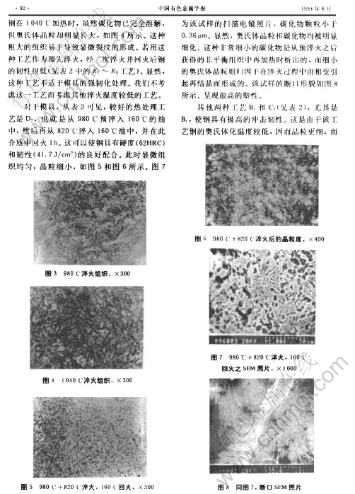 摘 要:以预先淬火获得的非平衡组织作为原始组织,对冷模具用GCr15钢的强韧化处理进行了实验研究。对经不同热处理后钢的硬度和冲击韧性进行了测定,对显微组织和断口形貌用金相和扫描电镜进行了观测。结果表明,由980℃淬入160℃的热油中作为预处理,然后再从820℃淬入相同介质中,并于160℃回火1h,可显著细化碳化物和奥氏体晶粒,使模具具有良好的强韧性配合,从而可显著提高模具的使用寿命。