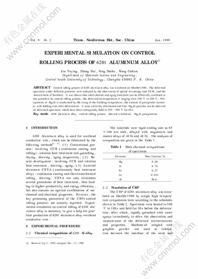 Key words:6201 aluminum alloy ,control rolling process ,thermal simulation, Mg2Si precipitation