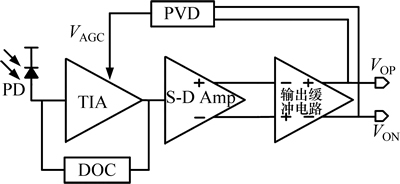 前置放大器芯片结构框图如图1所示,主要包括跨阻放大器(TIA)、单端转差分放大器(single-ended to differential-ended amplifier,S-D amp) 、输出缓冲电路 (driver)、峰值检测电路(peak-value detection,PVD)和直流消失调电路(DC offset cancellation,DOC)等。PD将不同功率的光信号转换为相应电流,跨阻放大器将电流信号转换为电压信号,并通过单端转差分放大器将其转换为差分信号。最后一级为输出缓冲电路,输出电阻为50 Ω。PVD检测前置放大器输出端口电压VOP和VON,产生自动增益控制电压VAGC。DOC保持前置放大器输入级的直流工作点稳定,输入输出电压相等。