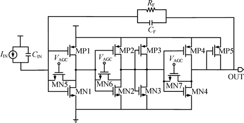 跨阻放大器电路如图2所示。光电二极管原型复杂,简化为寄生电容与理想电流源的并联。图2中,IIN为流过光电二极管的电流,CIN包含光电二极管的寄生电容、TIA(transimpedance amplifier)输入管脚Bonding寄生电容、输入晶体管寄生电容等,它限制了电路的最大带宽。晶体管MN1,MN2,MN4,MP1,MP2和MP4构成3级推挽反相器,电阻RF与电容CF构成反馈电路。3级推挽反相器和反馈电路组成跨阻放大器,输出端口为OUT。第2级和第3级反相器输出节点增加了二极管连接方式连接的晶体管MN3,MP3和MP5,降低了节点阻抗,减小了密勒效应。晶体管MN5,MN6和MN7组成具有自适应功能的自动增益控制电路,提高了电路的输入动态范围。