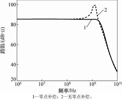 为虚零点补偿后反馈环路的阻尼系数。比较式(8)和式(12)可知:补偿电容在不改变电路结构与增益的条件下,增大了反馈环路的阻尼系数,提高了环路的稳定性。因此,在3级推挽反相器增益带宽积固定时,采样虚零点补偿技术的跨阻放大器,可以通过增大3级推挽反相器增益A提高工作速率至2.5 Gbit/s。跨阻放大器的频率特性仿真结果如图4所示。采用虚零点补偿的跨阻放大器-3 dB的带宽为1.8 GHz,跨阻为84.5 dB·Ω。若不采用虚零点补偿,则反相器增益的增加导致主极点下降后,跨阻放大器的频率响应产生振铃现象。