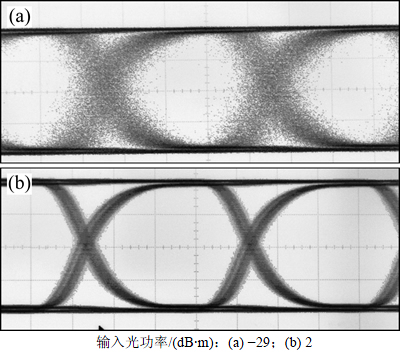 前置放大器的眼图测试通过Advanstest D3186函数信号发生器和Agilent DCA 86100A眼图仪完成测试。函数信号发生器产生速率为2.5 Gbit/s、周期为210-1的伪随机二进制码(PRBS),并通过光模块发射消光比为12 dB的输出激光信号,激光信号经过光衰减器后作为前置放大器的输入。图7所示为前置放大器在-29 dB·m和2 dB·m输入光功率下的输出眼图,眼图清晰,输出电压摆幅为380 mV。