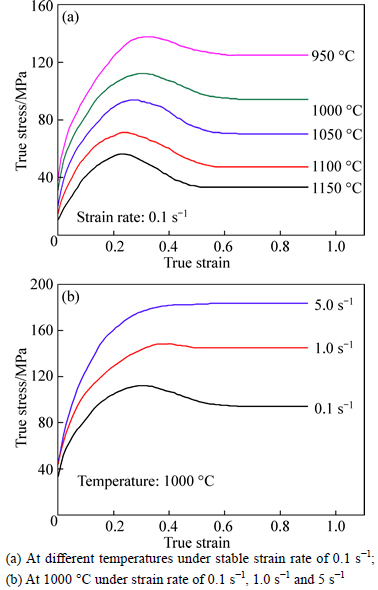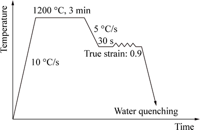 The hot compression tests were performed on Gleeble-1500 thermo-simulation machine in the temperatures range of 950-1150 °C, at an interval of 50 °C, under constant strain rate of 0.1, 1 and 5 s-1, up to the true strain of 0.9. Each specimen was heated to 1200 °C at a rate of 10 °C/s and held for 3 min, and then cooled to the deformed temperature with the rate of 5 °C/s and held for 30 s. After deformation, the specimens were immediately quenched in tap water. During the whole tests, the high purity argon was used as protective gas. The thermomechanical processing schedule is schematically shown in Fig. 1.