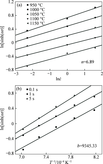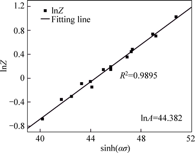 at all temperature levels with Fig. 4(a), and at the given true strain (ε=0.1), n is 6.89. The parameter b is determined from the slope of ln[sinh(ασ)]-1/T at different strain rates (Fig. 4(b)). The value of Qdef at the true strain of 0.1 is obtained as 535.40 kJ/mol. The value of lnA can be derived from the slope of line in lnZ-sinh(ασ) curves, in Fig. 5. The value of lnA at the true strain of 0.1 is calculated to be 44.382.