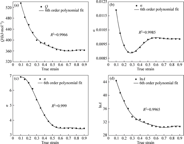 Fig. 6 Variations of material constants Q (a), α (b), n (c) and lnA (d) as a function of true strain using a sixth order polynomial fit for investigated microalloyed steel