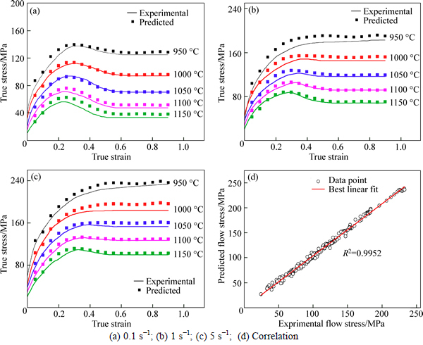 From Figs. 7(a), (b) and (c), it can be seen that the constitutive model can efficiently predict the flow stress of the investigated material over the entire range of deformation conditions. The precision in Fig. 7(d) shows that most data points lie fairly close to the best regression line and the square correlation coefficient for the constitutive model is 0.9962. In conclusion, the constitutive model can effectively predict the high temperature flow behavior of the investigated steel.