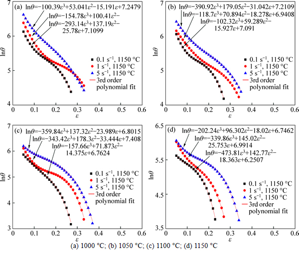 Fig. 8 lnθ-ε curves under hot deformation conditions at different strain rates and temperature: