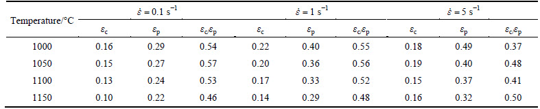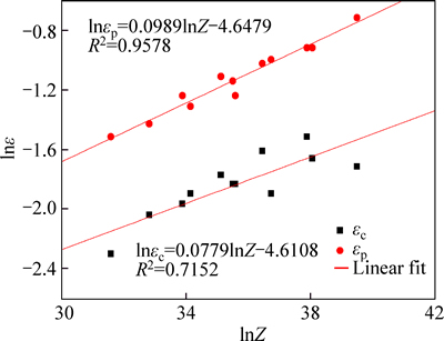 During the hot deformation process, the peak strain and critical strain are determined by Z and ε. At a constant value of Z parameter, the microstructure of material undergoes the process of WH, DRV, partial recrystallization and full recrystallization. According to the calculated values of calculated εc, εp and Z parameter, the relationship among εc, εp and Z parameter are shown in Fig. 9.