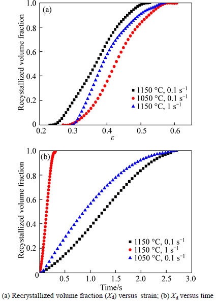 Figure 11(a) shows that the recrystallization curve moves to right by increasing strain rate at the constant temperature of 1150 °C or decreasing deformation temperature under constant strain rate of 0.1 s-1.Figure 11(b) illustrates that the DRX volume fraction (Xd) increases with the increasing of strain rate and decreasing of temperature.