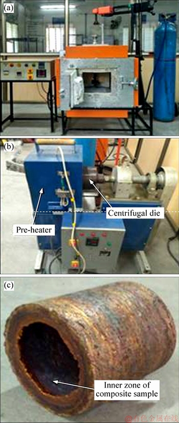 This functional graded copper composite was fabricated through stirring casting route, using horizontal centrifuge casting. Among the liquid state methods used for composite material synthesis, stirring casting is considered the most effectively implemented technique where the ceramic particles acts as a well distributed phase within the molten matrix. Mechanical stirring was performed with controlled operating parameters like stirrer speed and working temperature which in turn ensured better distribution. At first, 85% of copper was melt in a crucible (graphite made) kept within an electric furnace (Figure 2(a)) of chamber with dimensions of 300 mm×300 mm×250 mm. The inner chamber was designed to withstand a peak temperature of 1440 °C and a stirrer rotation was set within a range of 0-800 r/min. Nickel (11 wt %) and silicon (4 wt%) were mixed for alloying the copper molten melt, which was used to prepare the base alloy. Melting process was progressed in an inert argon atmosphere to prevent undesirable chemical reactions, where gas was released to the chamber at a rate of 2-3 L/min. This molten metal (alloy) was stirred at a stirrer speed of 150 r/min powered by a 0.25hp motor.