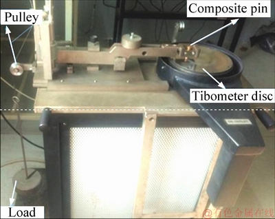 Rectangular specimens with dimensions of 12 mm×12 mm×15 mm were used for dry sliding wear tests. Specimens from the inner wall of the composite were milled in such a way that the square faced (12×12) pins were in effective contact with the sliding surface. Experimental pin height was increased using stainless steel pipes of 35 mm length fixed over the specimen counter-face through cold setting. Tester was ASTM-G99 based using a pin-on-disc tribology tester (Figure 4). Track diameter (90 mm) was maintained unchanged for all the experiment trials. Each trial was performed by sliding the pin over stainless steel to make rotating disc of 8 mm disc thickness. The rotational velocity for the disc was fixed within 200-2000 r/min. The load limit was maintained at a range of 5-200 N. The disc sliding surface had a surface roughness of 0-2000 μm. The hardened steel which acts as a counter face, was cleaned before each cycle using emery papers (1/0, 2/0 grit size) to ensure proper interfacial contact. The parameters for these experiments were applied load within a range of 15 to 35 N and in splits of 10 N, slide distance in range of 750 to 2250 m and in splits of 750 m and slide velocity within range 1.5 to 3.5 m/s in splits of 1 m/s. Experimented sample was made burr-free before each weigh trial. The mass reduction of each specimen after each trial was recorded for comparison. Wear rate was later calculated out of it. Cyclic stress induced at interfacial material surfaces leads to a phenomenon of adhesive wear. Similar inference was obtained by TJONG et al [20]. COF was also measured using the in-built function of DUCOM software, during each cyclic experiment.