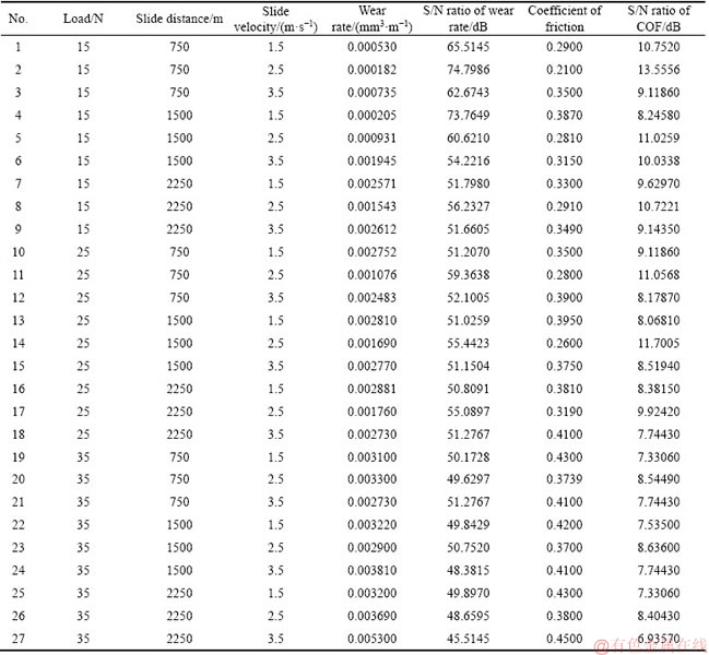 The tribo-performance of the inner composite specimens was prioritized during adhesive tribo-test as this zone exhibited superior mechanical strength. The wear experiment results and its signal-to-noise (S/N) ratios are listed in Table 1.