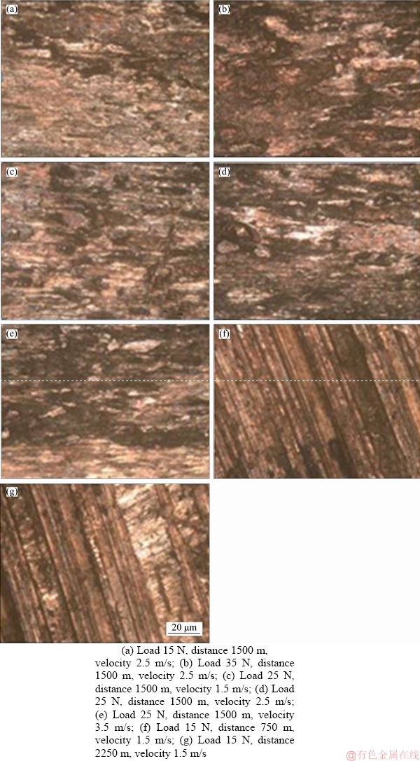 Figure 8 Metallurgy microscopy images of specimen surfaces worn at varied sliding conditions: