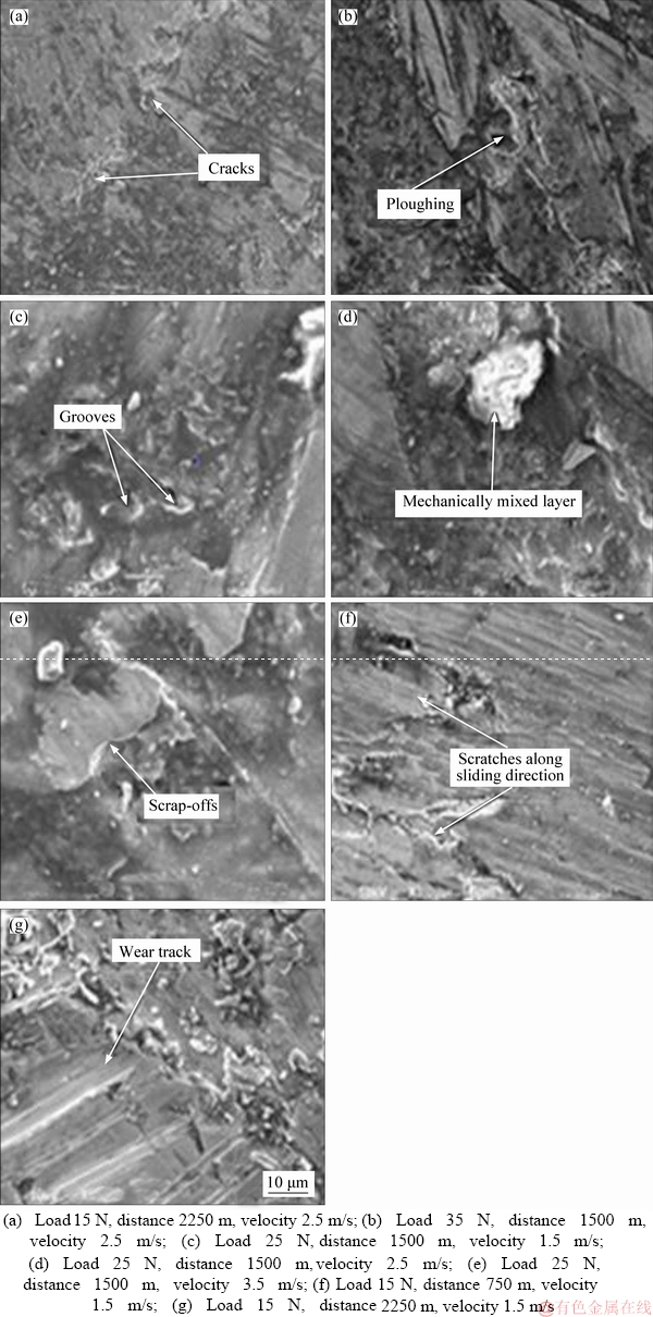 The influence of varied velocities (1.5, 2.5, 3.5 m/s) with unchanged slide distance (1500 m) and applied load (25 N) is depicted in Figures 9(c), (d) and (e), respectively. At 1.5 m/s, composite surface showed (Figure 9(c)) intense wear features like strain zones and micro cuts towards the slid direction. Low radius pits and scratches were resulted out of prolonged interfacial scrub of composite specimen and sliding counter face at low velocity. Weakened bond strength at the matrix- reinforcement interface, under high fatigue stress has led to the pull-out of reinforcements. With these features, it is interpreted that abrasive wear is the dominating tribological phenomenon at low slide velocity (1.5 m/s) and thus produced intense rate of wear. The specimen worn at intermediate velocity (2.5 m/s) revealed (Figure 9(d)) features of shallow scrubs with wider pits or grooves producing low intense wear with low COF. This was also due to the occurrence of a tribolayer (MML), which contributed more towards the minimal rate of wear. A similar inference was reported by BHATIJA et al [26]. At higher velocity (3.5 m/s) of slide, under unchanged slide distance and applied load, features like flake formations were observed (Figure 9(e)) along the worn surface. These features have led to broad ploughing phenomenon, indicating severe wear. This was due to the scrap-off of tribolayer at extreme velocity.