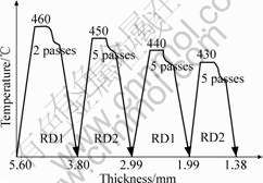 Fig.1 Schematic illustration of cross rolling schedule (RD1—Initial rolling direction; RD2—Rotating by 90? about normal direction)