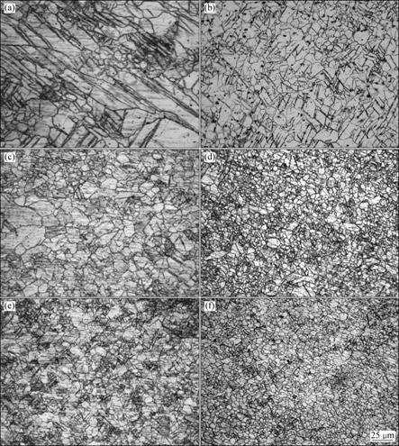 Fig.2 Microstructural evolution during route A and route B process: (a) UR, 2.99 mm, (b) CR, 2.99 mm, (c) UR, 1.99 mm, (d) CR, 1.99 mm, (e) UR, 1.38 mm; (f) CR, 1.38 mm